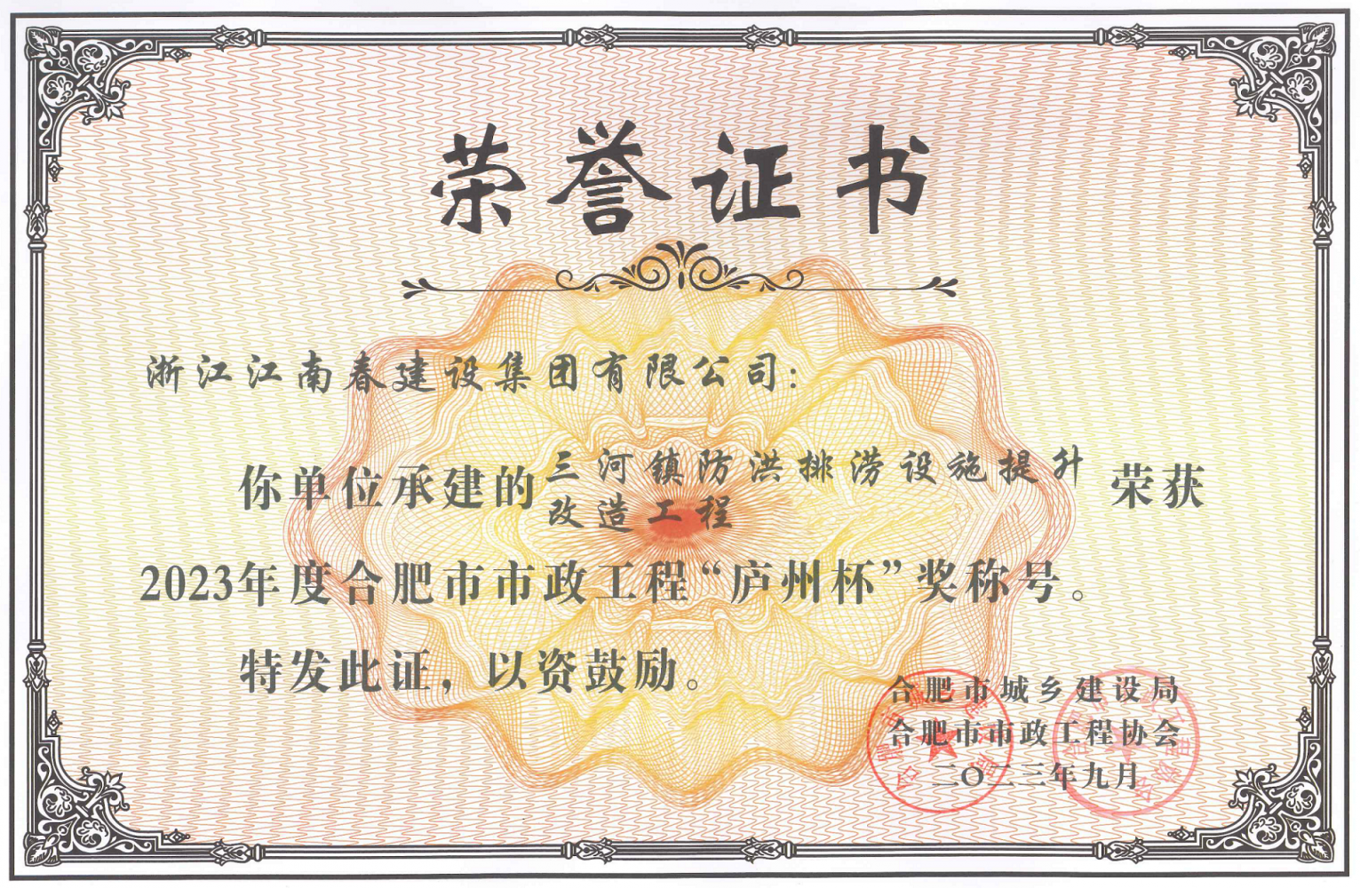 三河鎮(zhèn)防洪排澇設(shè)施提升改造工程榮獲2023年度合肥市市政工程“廬州杯”