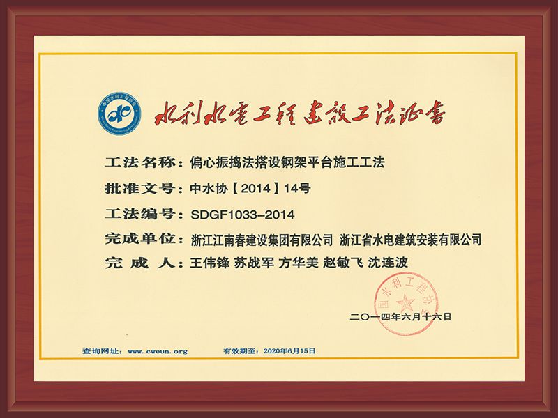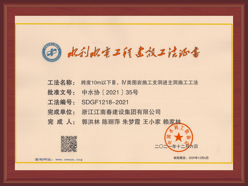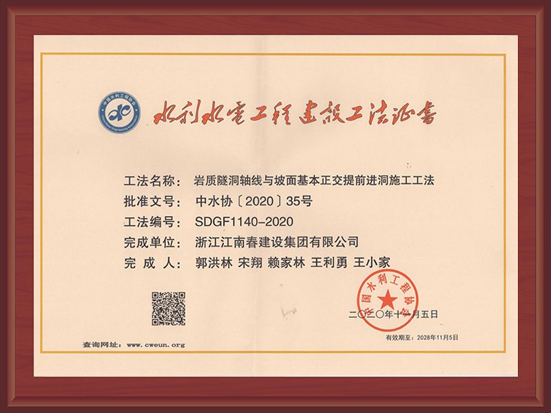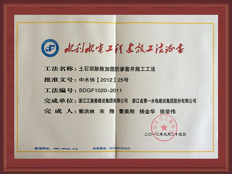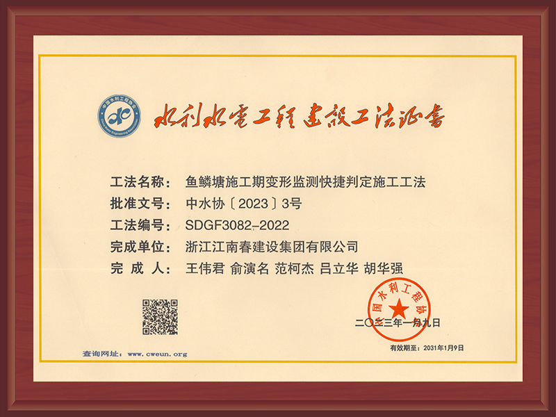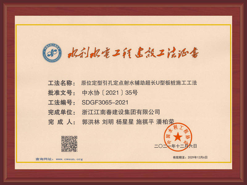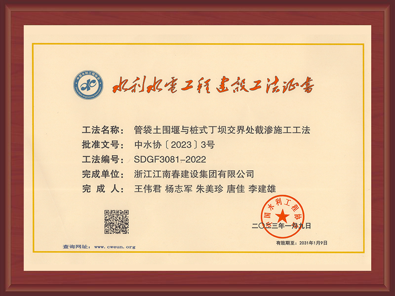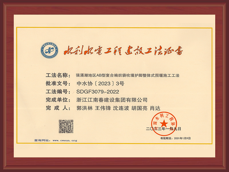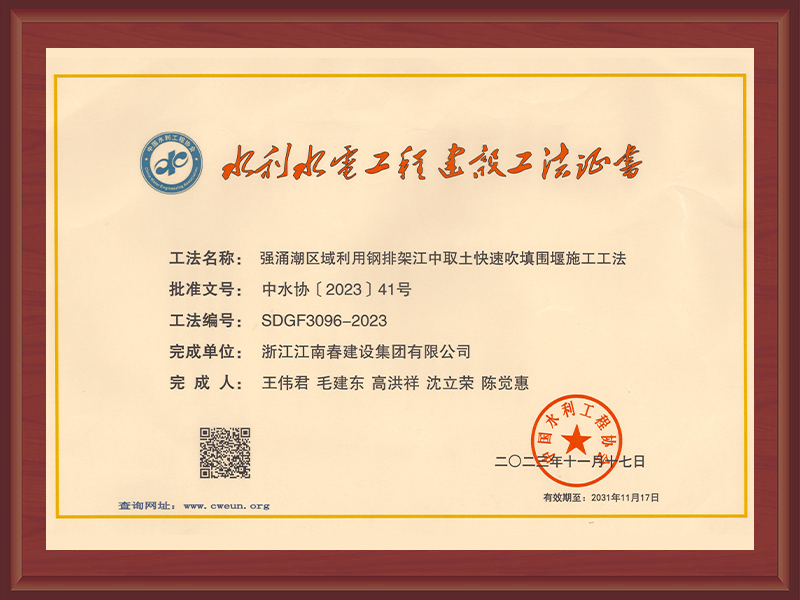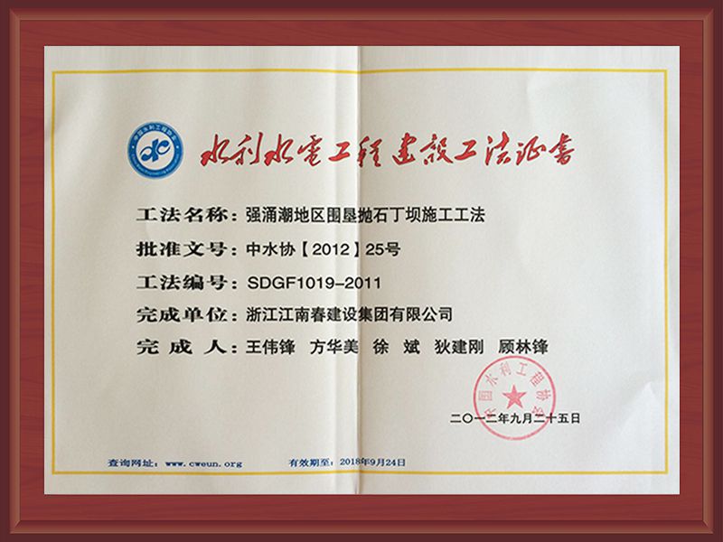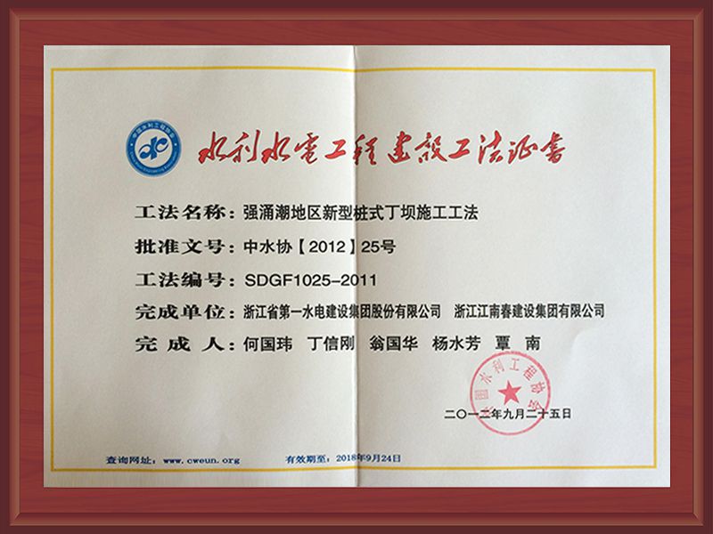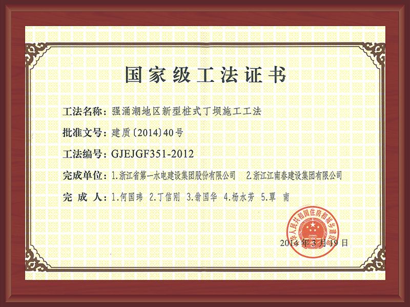 國家級工法證書(強(qiáng)涌潮地區(qū)新型樁式丁壩施工工法)